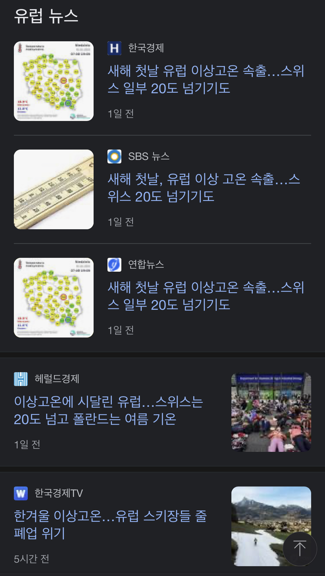 스위스 서북부 쥐라 자치주(칸톤)에 있는 들레몽의 기온은 1일 한때 20.2도로 관측되며 1월 역대 최고 기온을 갈아 치웠흠니다. 이처럼 1월 역대 최고 기온을 경신한 유럽 국가가 최소 8개국에 달한다고 합니다. 뜻 밖의 온화한 겨울 기온에 맞닥뜨린 러시아도 천연가스에 걸어 잠근 빗장을 일부 풀었습니다.