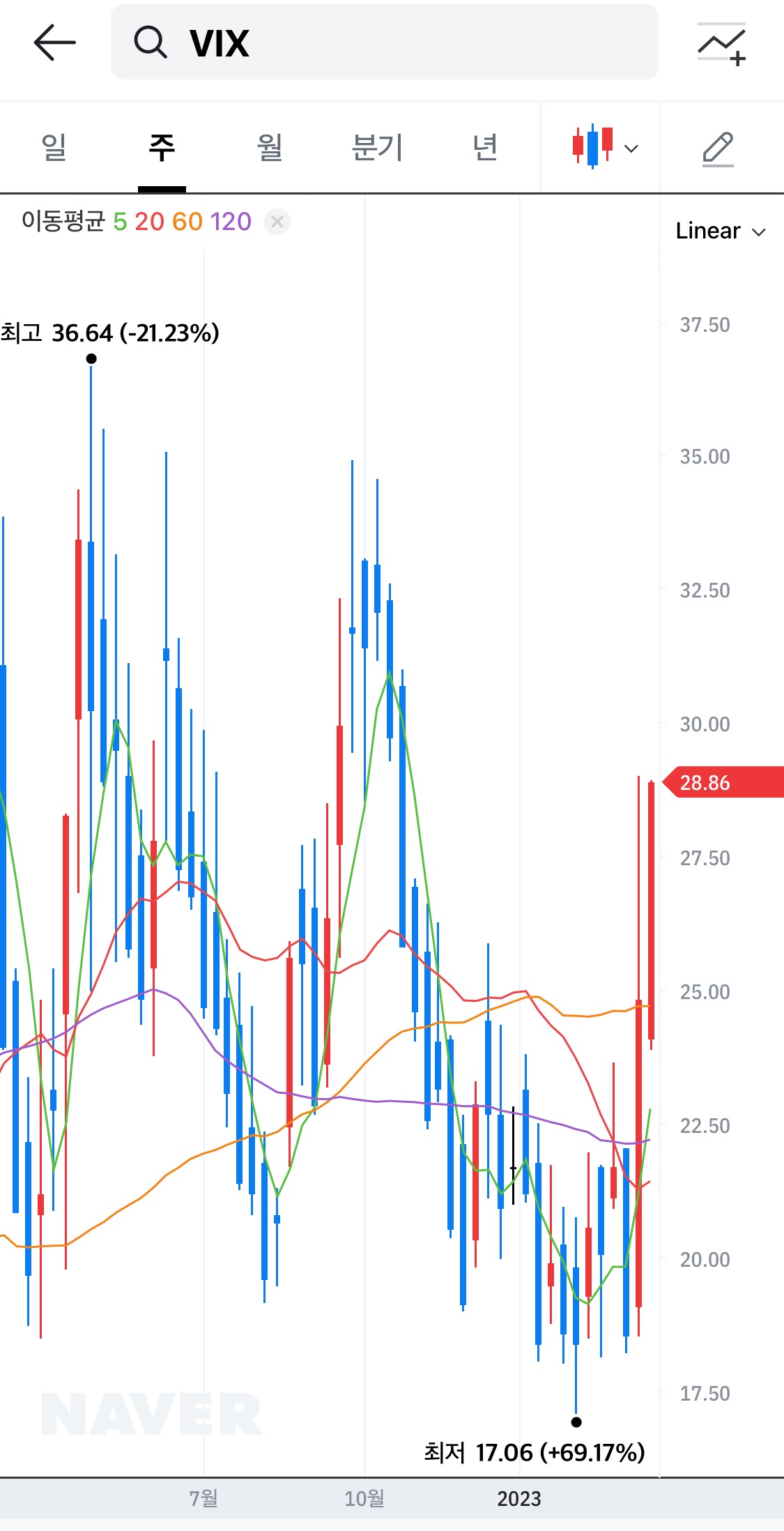 2023년 3월 실리콘밸리 은행 파산으로 인해 변동성지수인 VIX지수가 급등을 하고 있습니다.