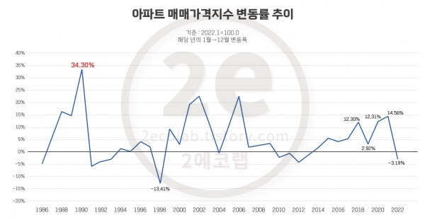 23일 KB부동산 주택가격동향 자료에 따르면, 데이터 집계가 시작된 1986년부터 2022년까지 37년 동안 연간 아파트 매매가격지수(기준: 2022.1=100.0)의 변동률(1월→12월 변동폭)은 26번 상승하고, 11번 하락했다.
