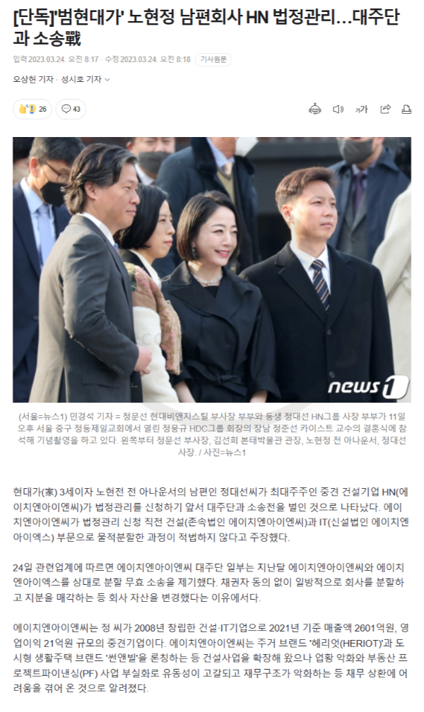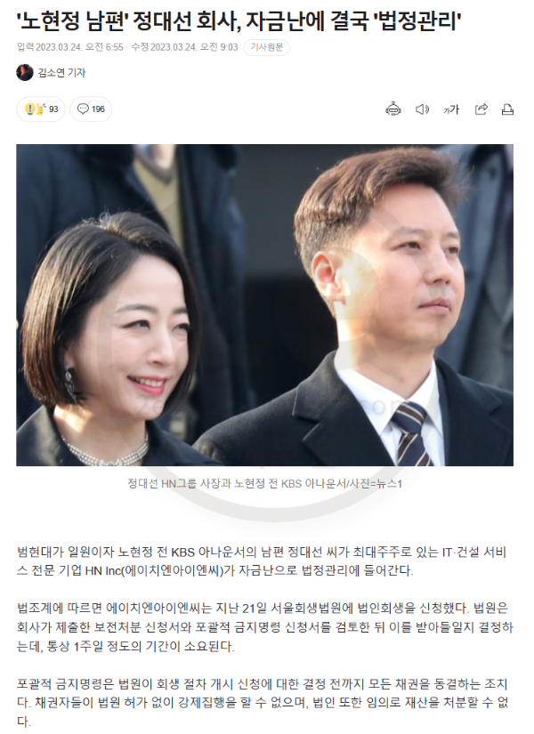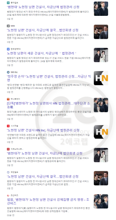 범현대가 일원이자 노현정 전 KBS 아나운서의 남편 정대선 씨가 최대주주로 있는 IT·건설 서비스 전문 기업 HN Inc(에이치엔아이엔씨)가 자금난으로 법정관리에 들어갔습니다.