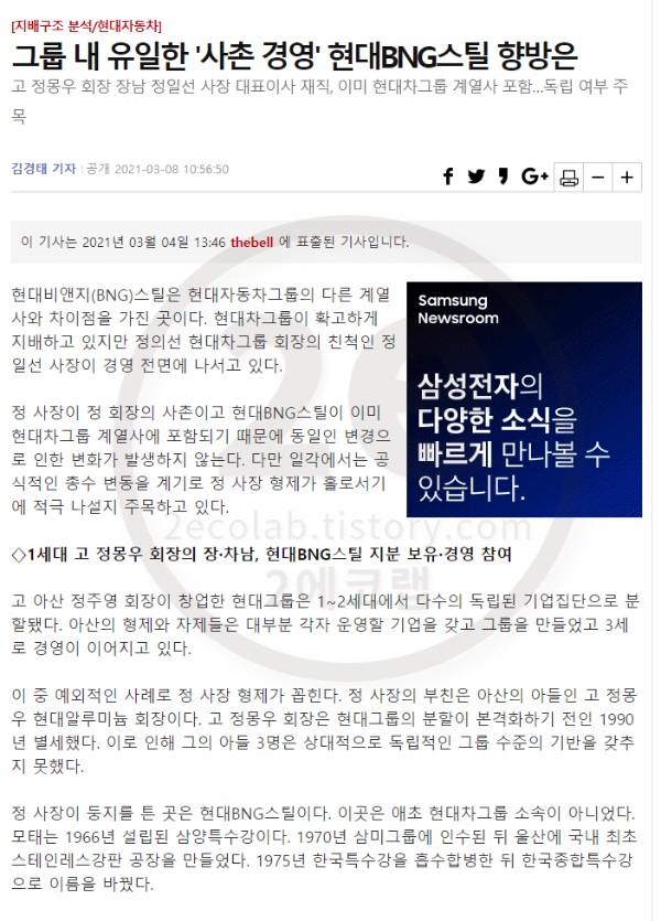 고 정몽우 회장은 현대그룹의 분할이 본격화하기 전인 1990년 별세했습니다. 이로 인해 그의 아들 3명은 상대적으로 독립적인 그룹 수준의 기반을 갖추지 못했습니다. 정일선 사장이 둥지를 튼 곳은 현대BNG스틸이다.