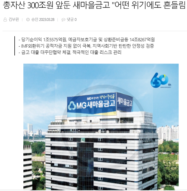 또한 새마을금고의 자산 안전성에 대해서 다음과 같이 언론사에서 보도를 했습니다.