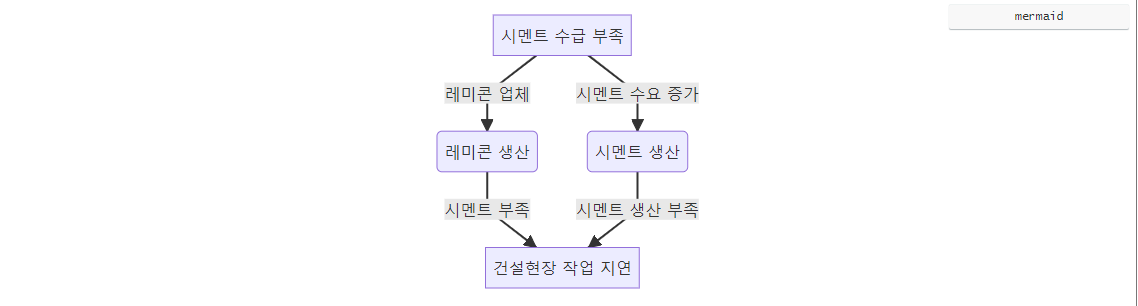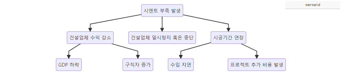B -->|시멘트 부족| C[건설현장 작업 지연]