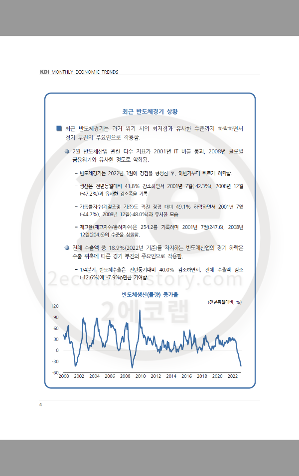 이와 같이 한국개발연구원(KDI)은 4월 경제동향에서 최근 반도체 경기가 2001년 IT 버블 붕괴, 2008년 글로벌 금융위기 때와 유사한 정도로 악화됐다고 분석했습니다.