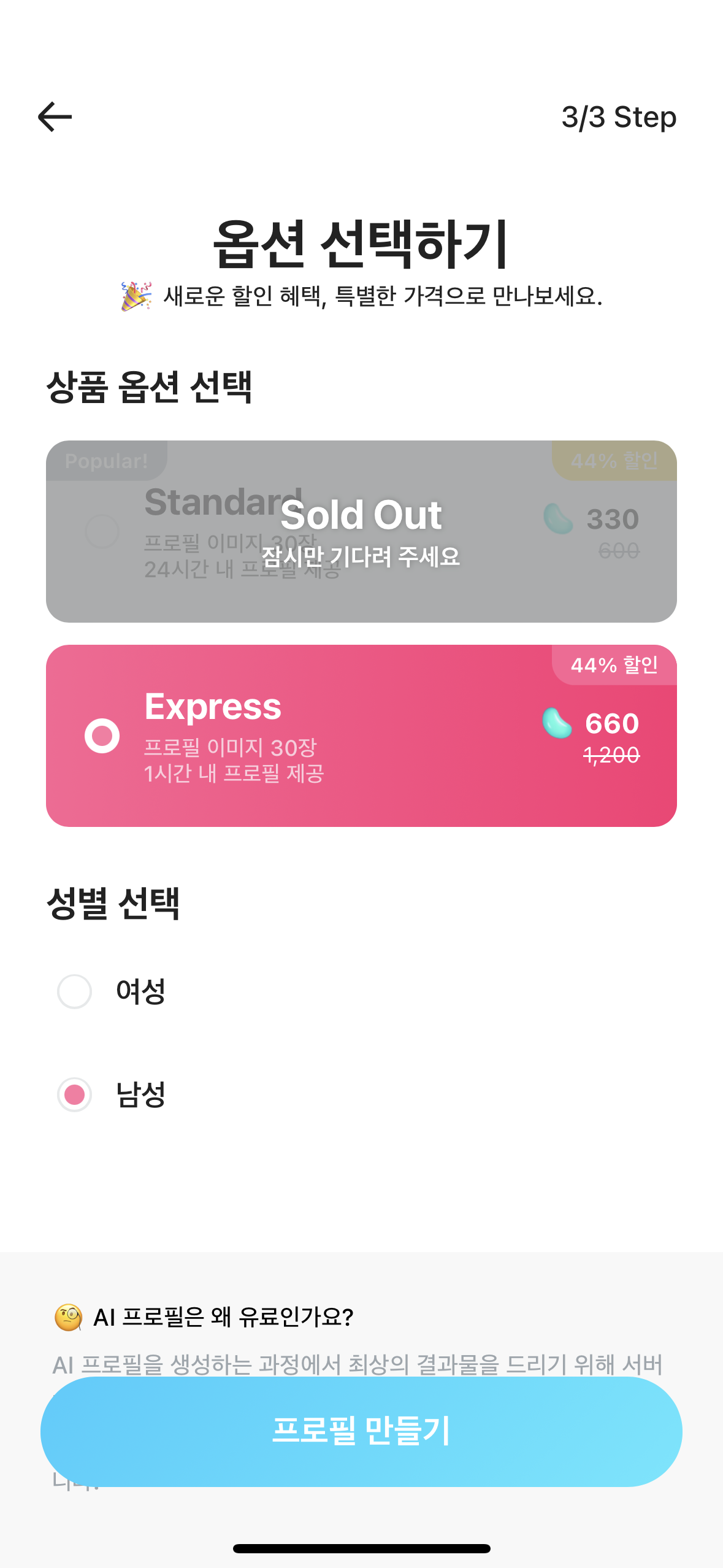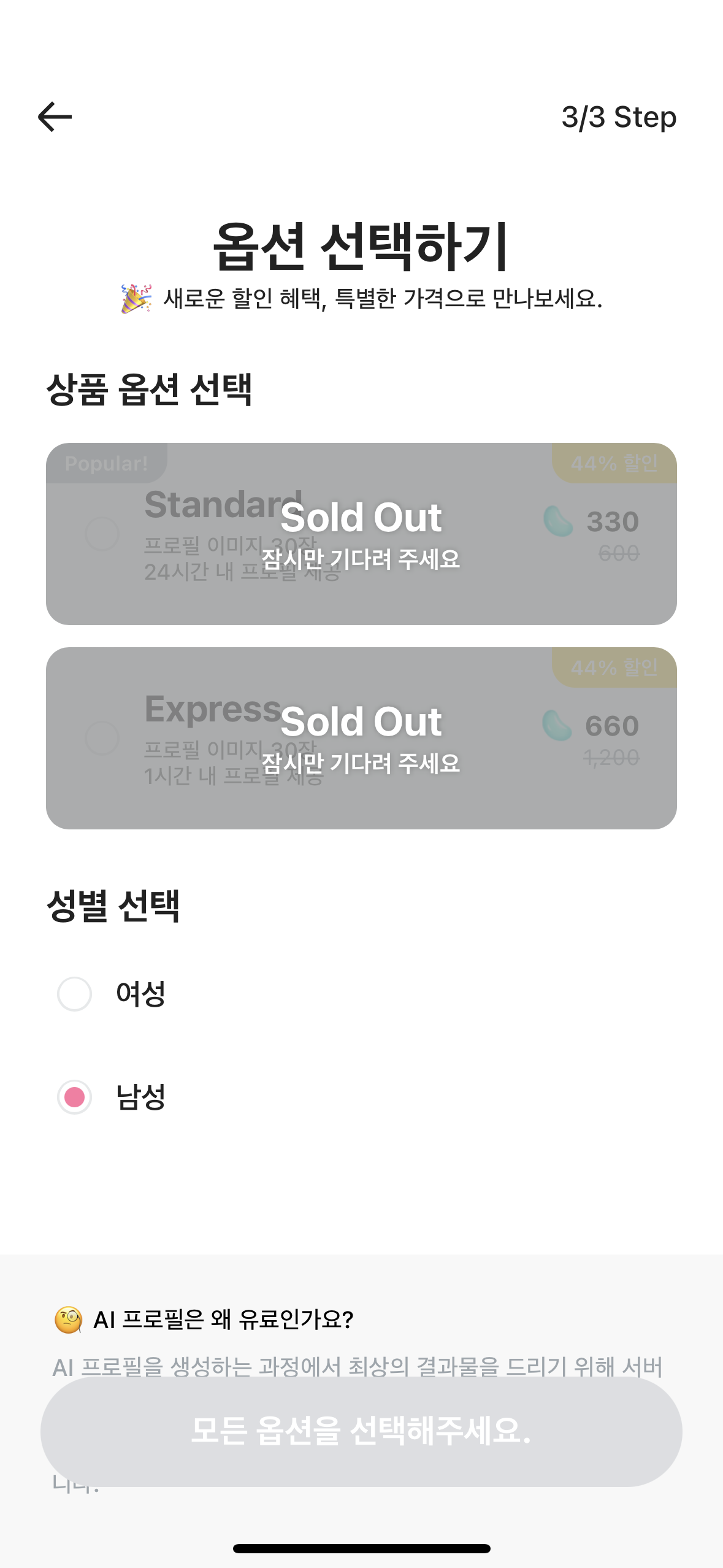 남성 버전과 여성 버전 중에서 원하는 버전을 선택하고, 마음에 드는 사진을 10장 이상 업로드하면 프로필이 제작되고, 제작 시간은 24시간 이내입니다.