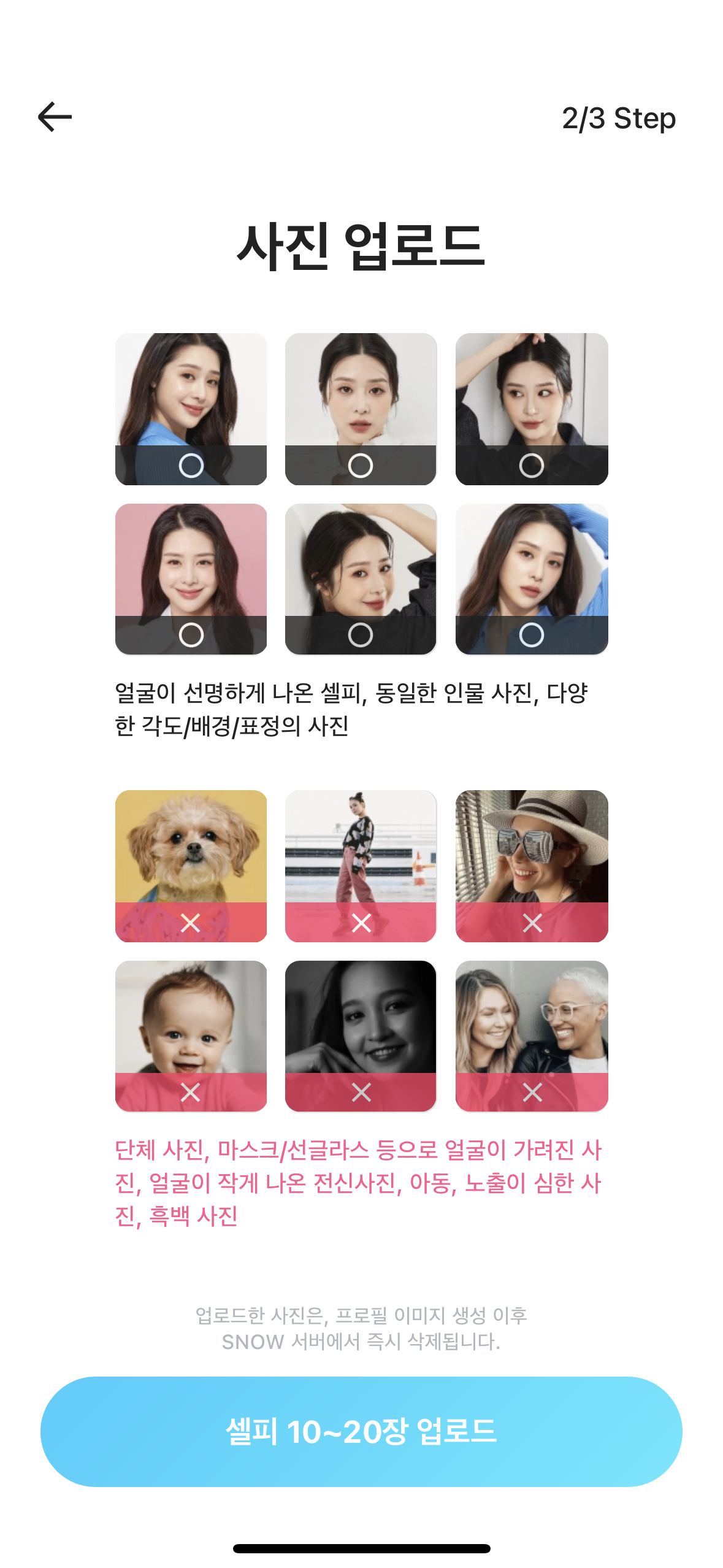 마음에 드는 사진을 10장에서 20장을 업로드합니다. (포즈가 다양하고 얼굴이 잘 보이는 사진이 좋습니다).