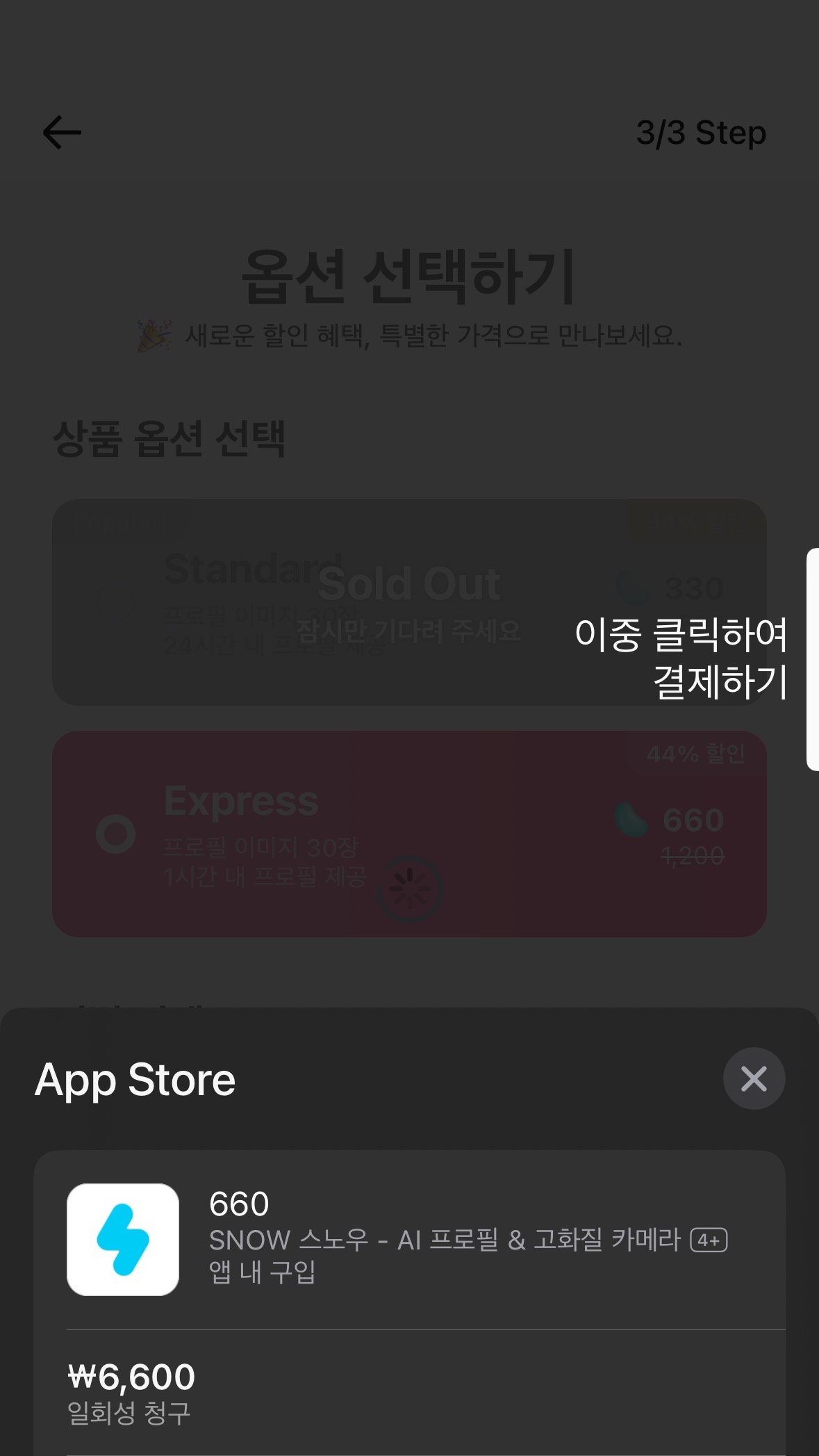 스노우 AI 프로필은 유료 서비스로, 24시간 내 제작엔 3,300원, 1시간 내 제작엔 6,600원을 결제해야 합니다.
